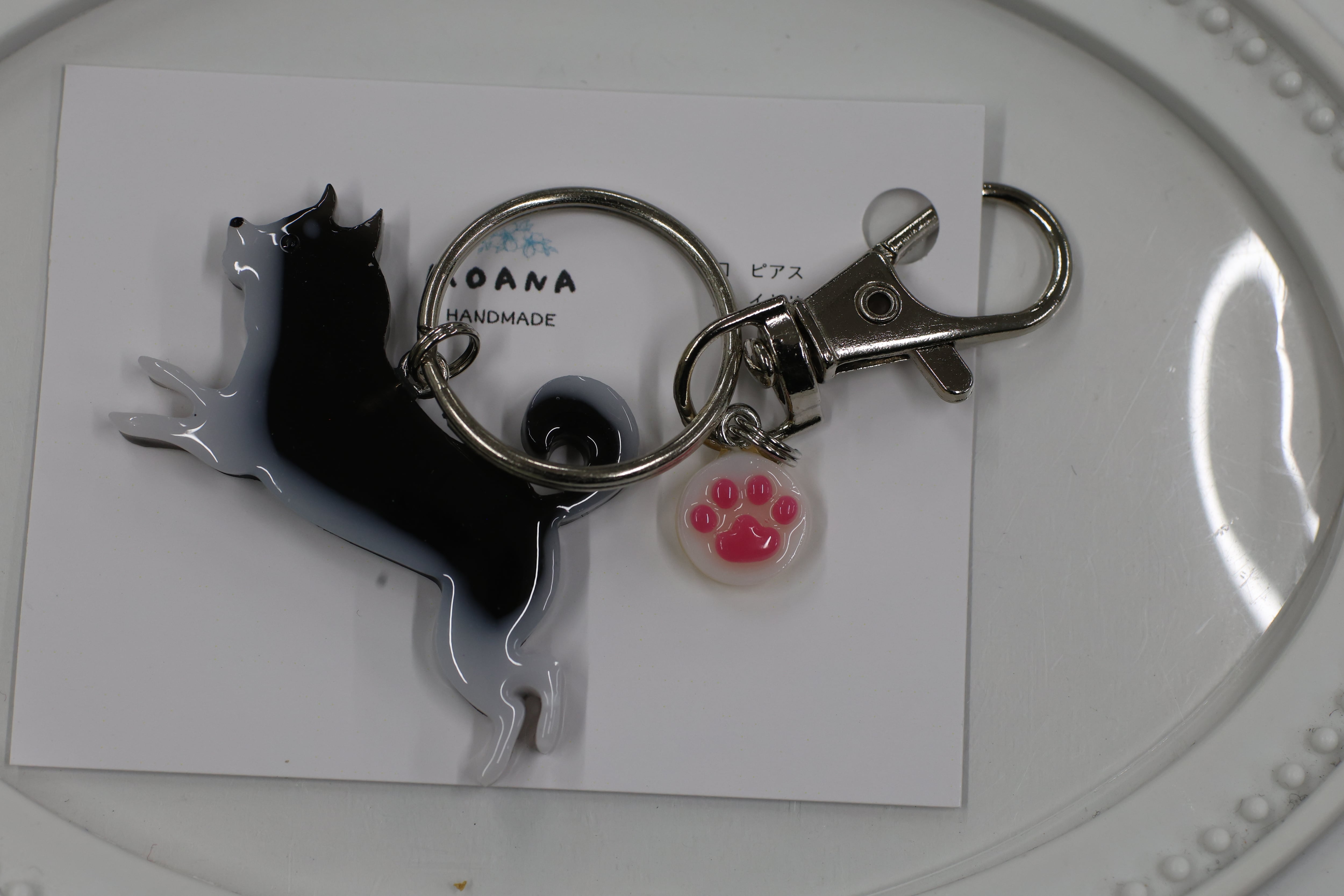 黒白のわんこのキーホルダー!ジャンプしています。裏面にはHappyのロゴ入り。