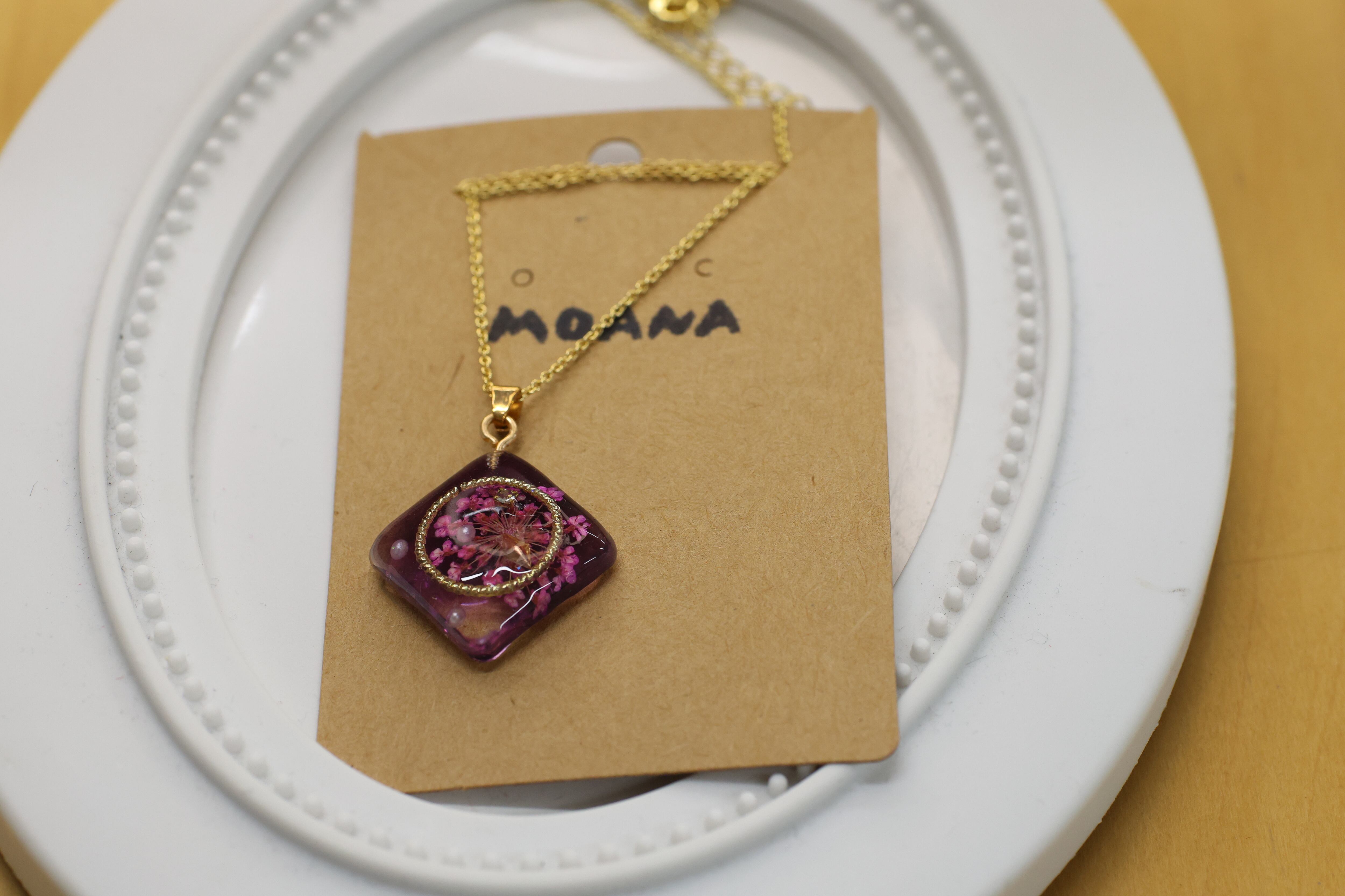 ピンクベースの中にキレイな押し花やパールなどが閉じ込められています!