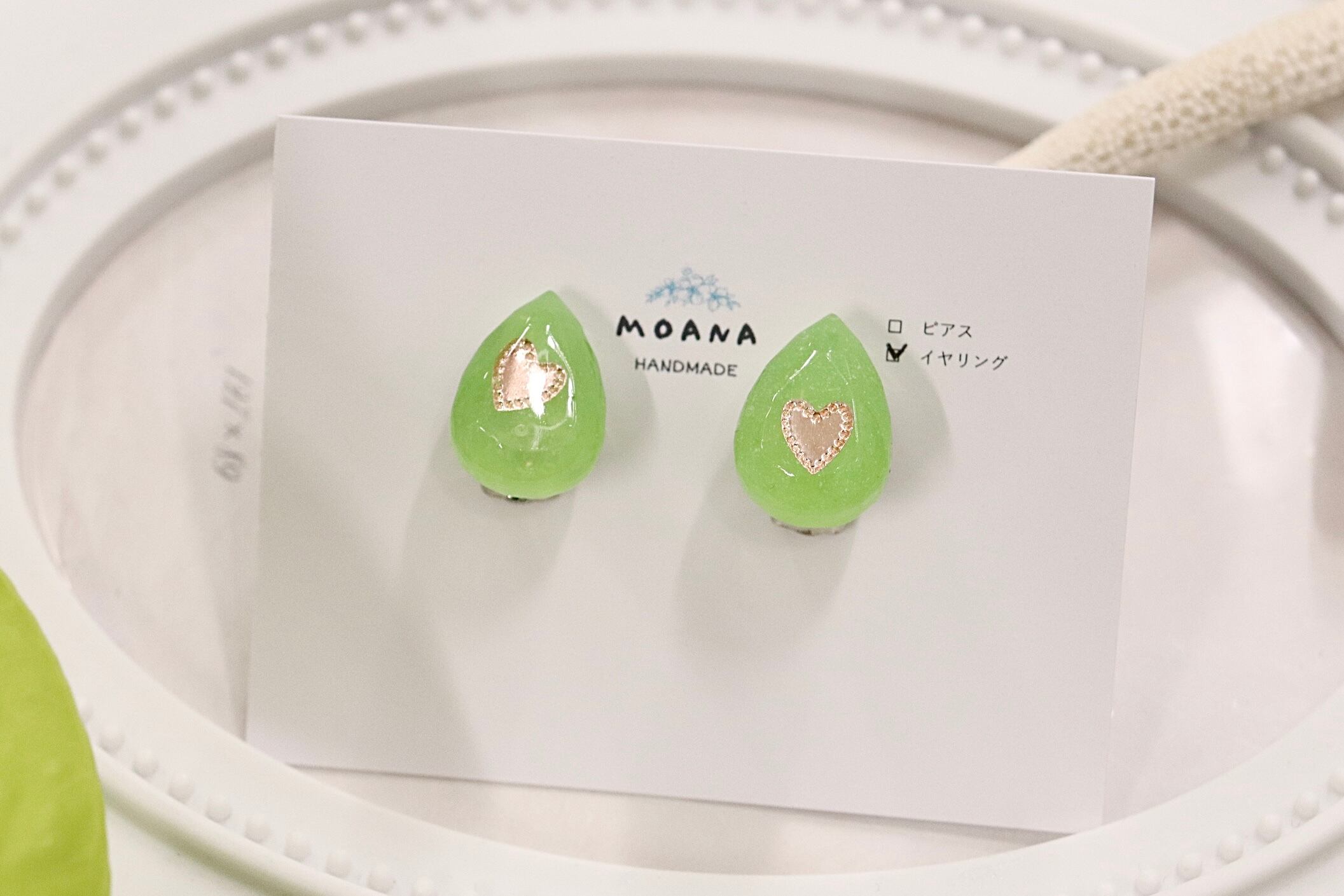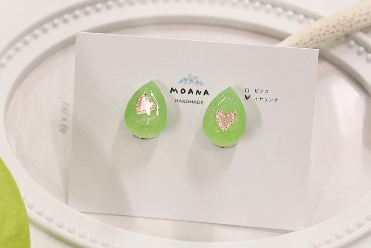 黄緑のしずくにハートのワンポイントが可愛いイヤリングです。