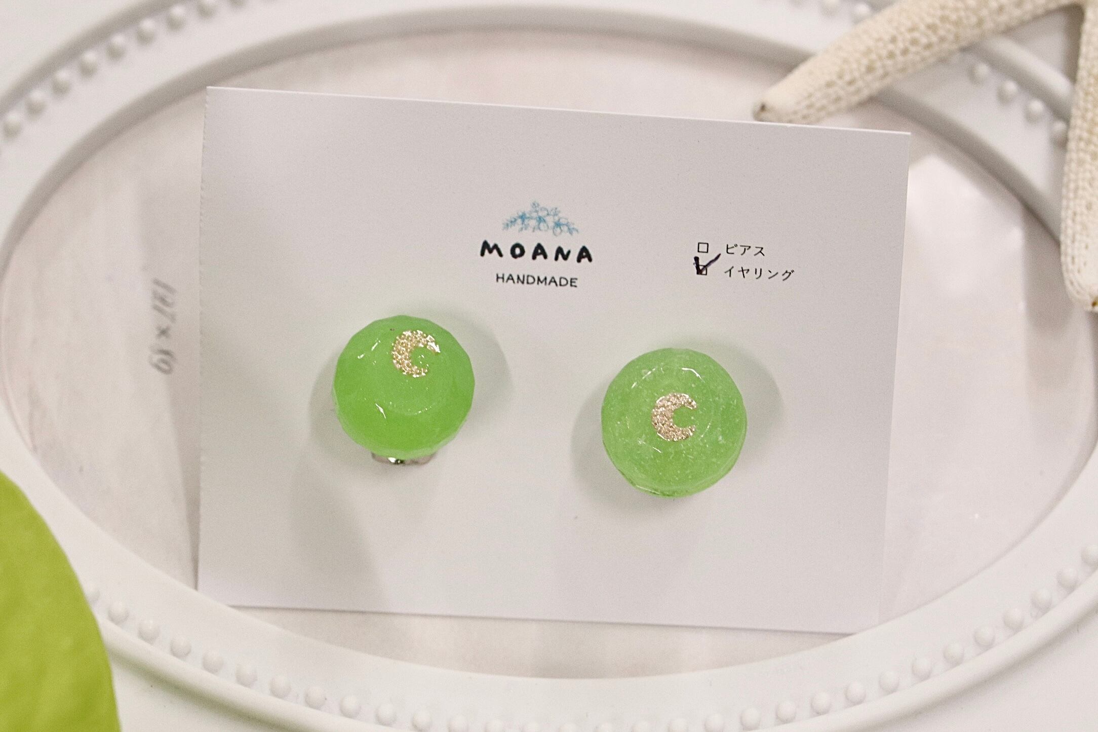 黄緑の翡翠を加工して月を宿したかのような神秘的なアクセサリーとなっております。