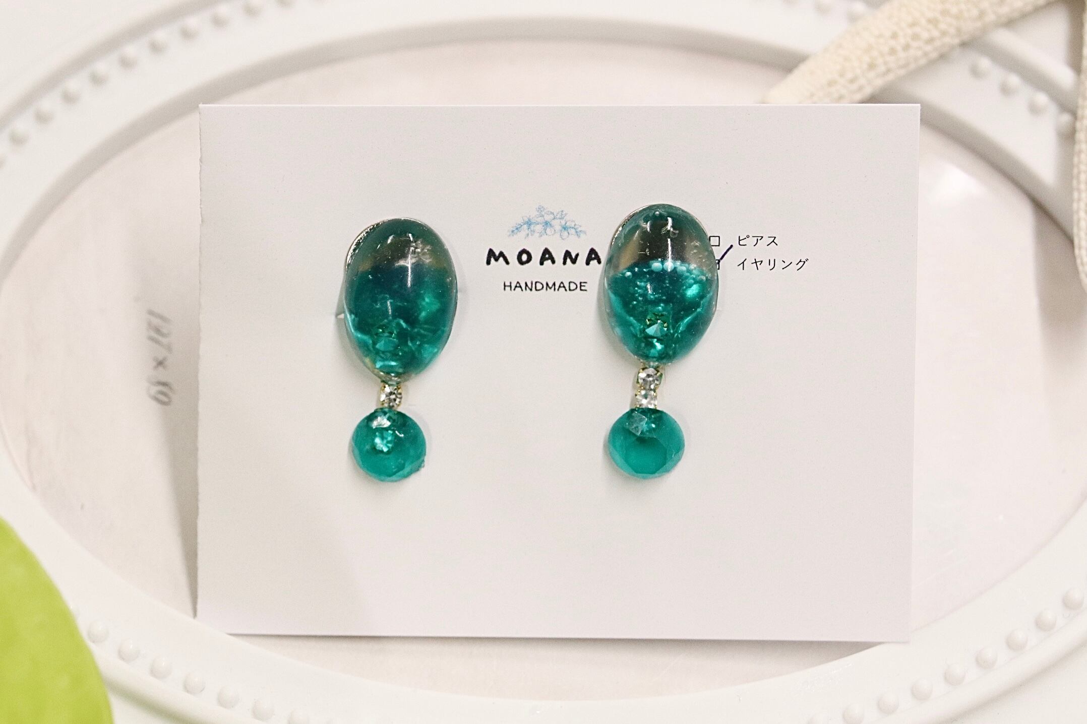揺れるパーツがオシャレな、高級感ある緑のイヤリングです。