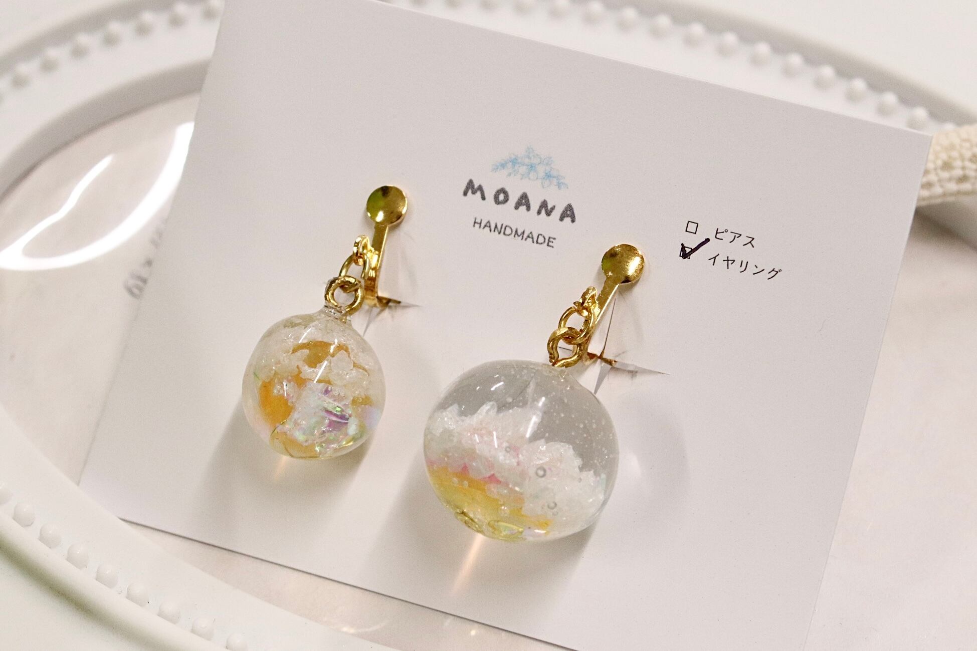 貝殻の欠片を水玉の中に閉じ込めて加工したかの様な左右大きさが違うアクセサリーです。