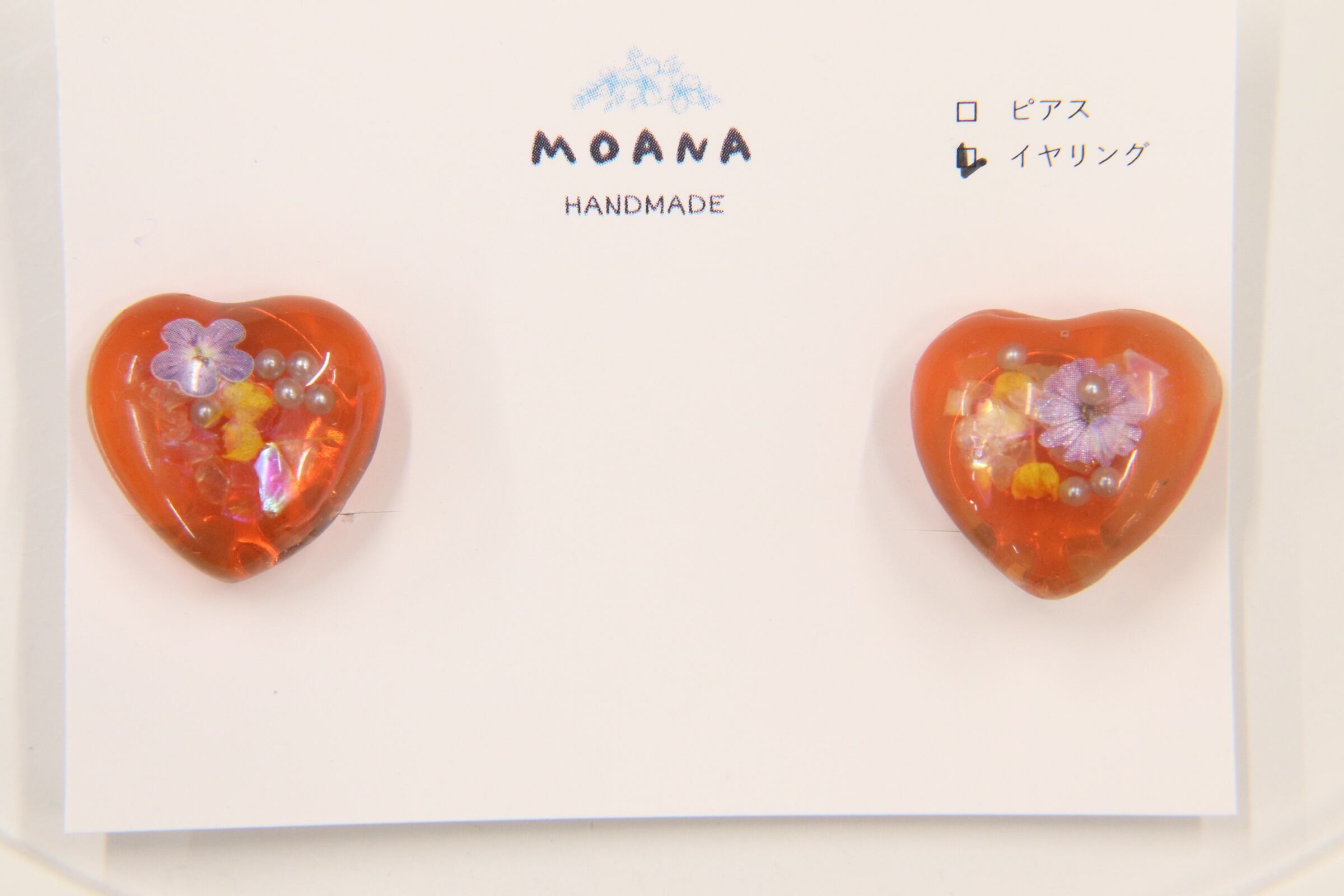 お花やパールが入った、赤いハートのイヤリングです。