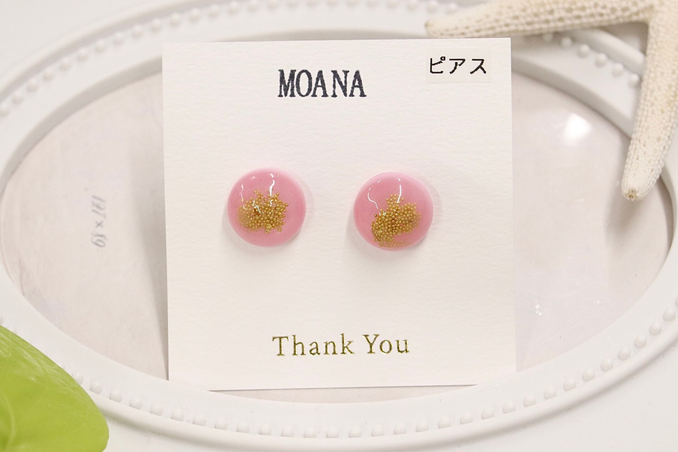 ピンクの丸型の中に金色の花火が咲いたようなシンプルなデザインのピアスです。