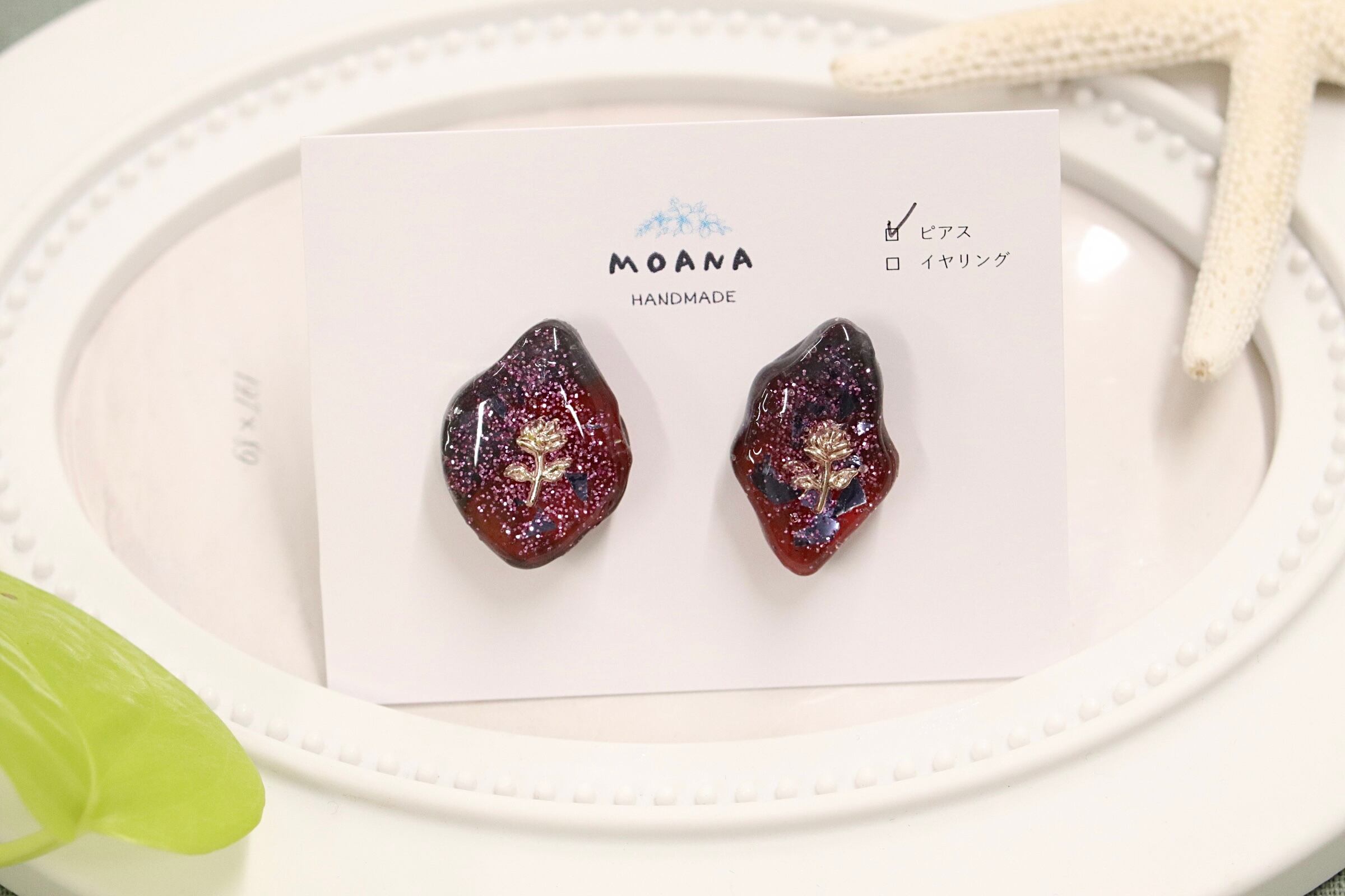 重厚感ある色にバラのパーツが印象的なピアスです。