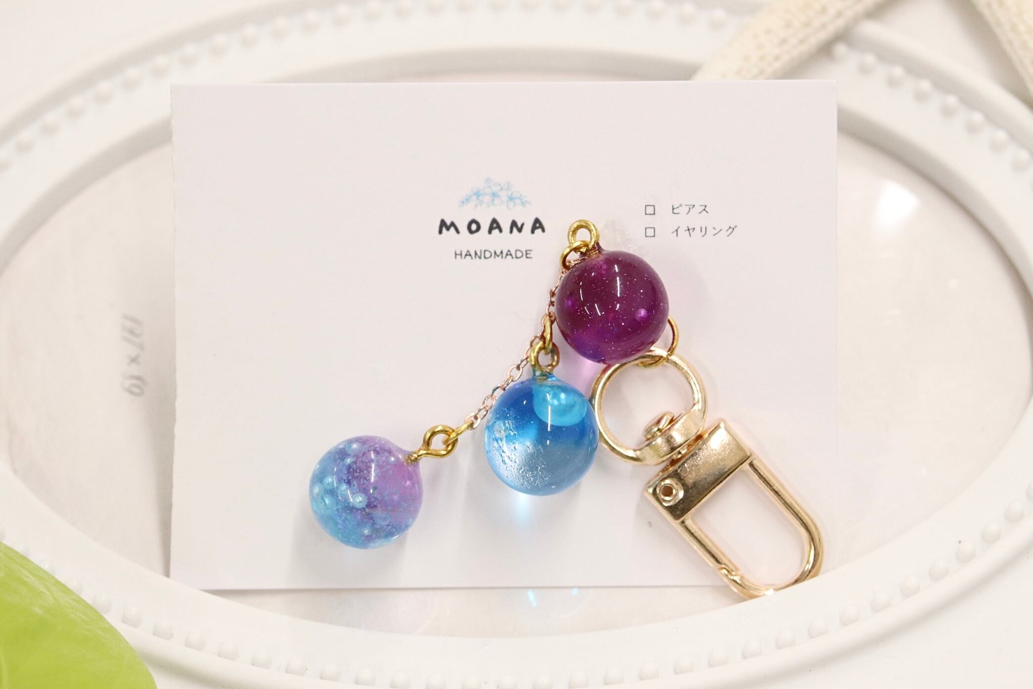 3つの球がついた、揺れると綺麗なキーホルダーです。