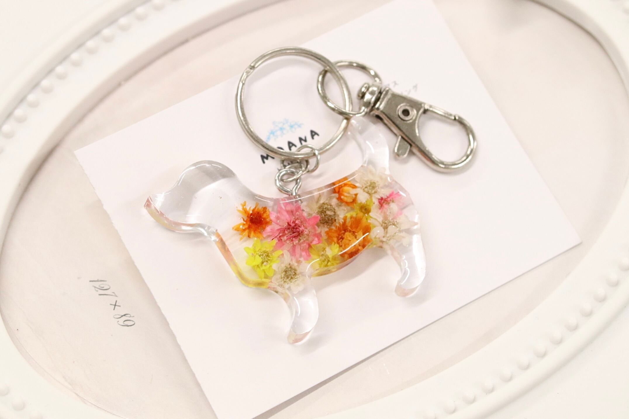 透明なワンちゃんの中にお花が入ったキーホルダーです。