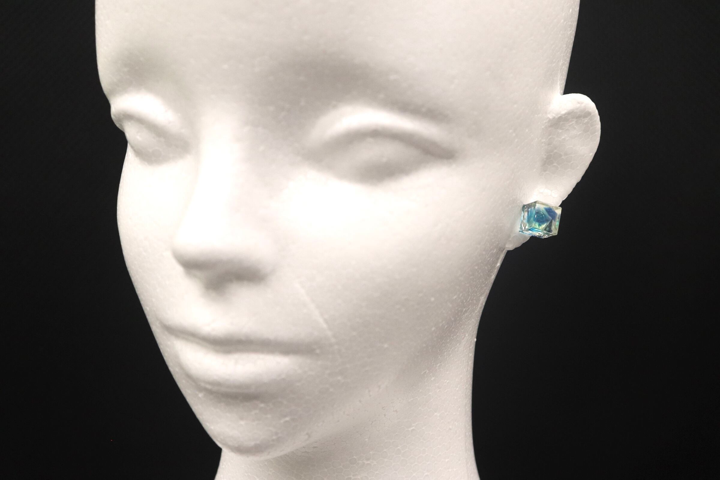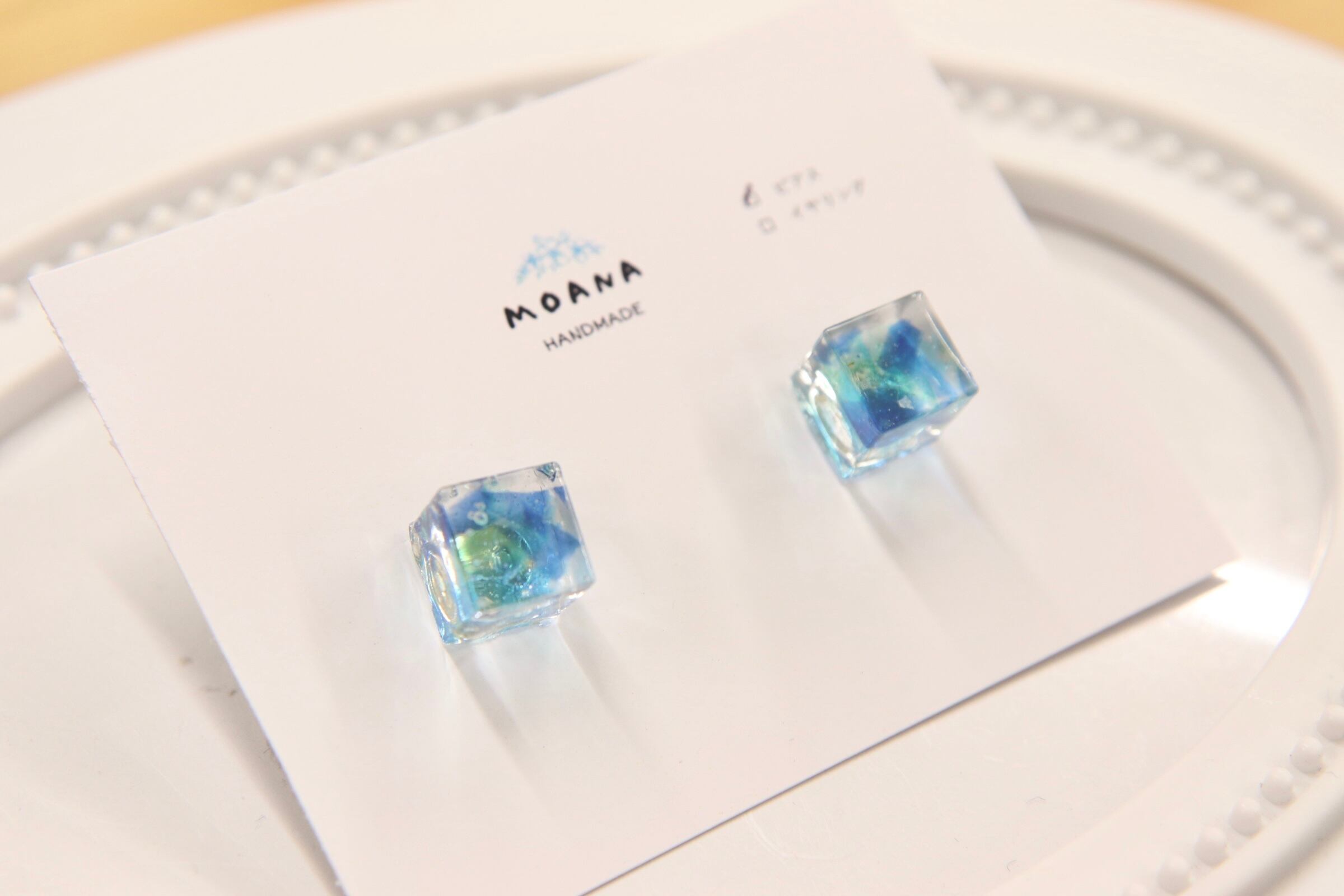 透明な四角の中に青いバラの花びらを散りばめた様な幻想的で可愛らしい落ち着いたピアスでございます。
