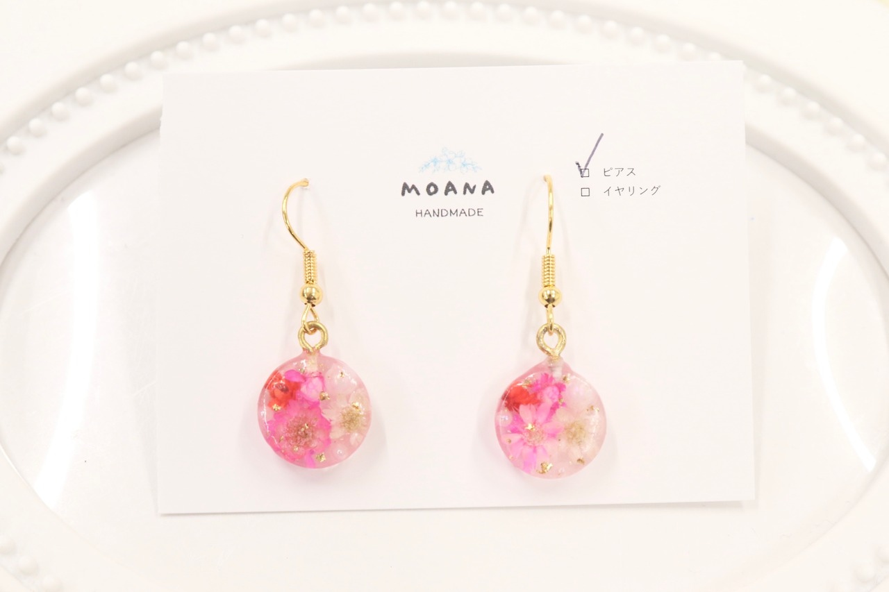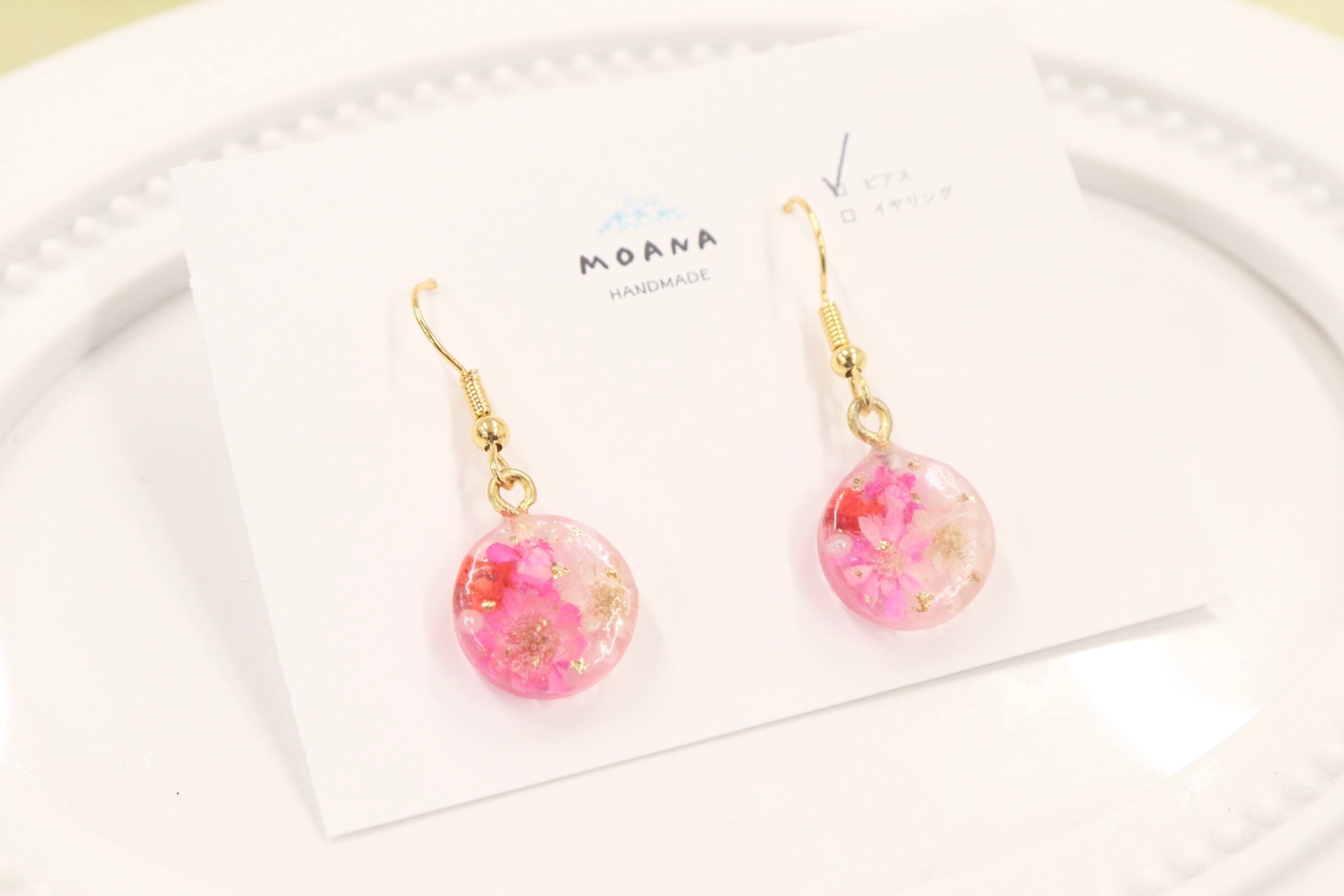 花をおはじき型の樹脂で固めて加工したようなアクセサリーです。