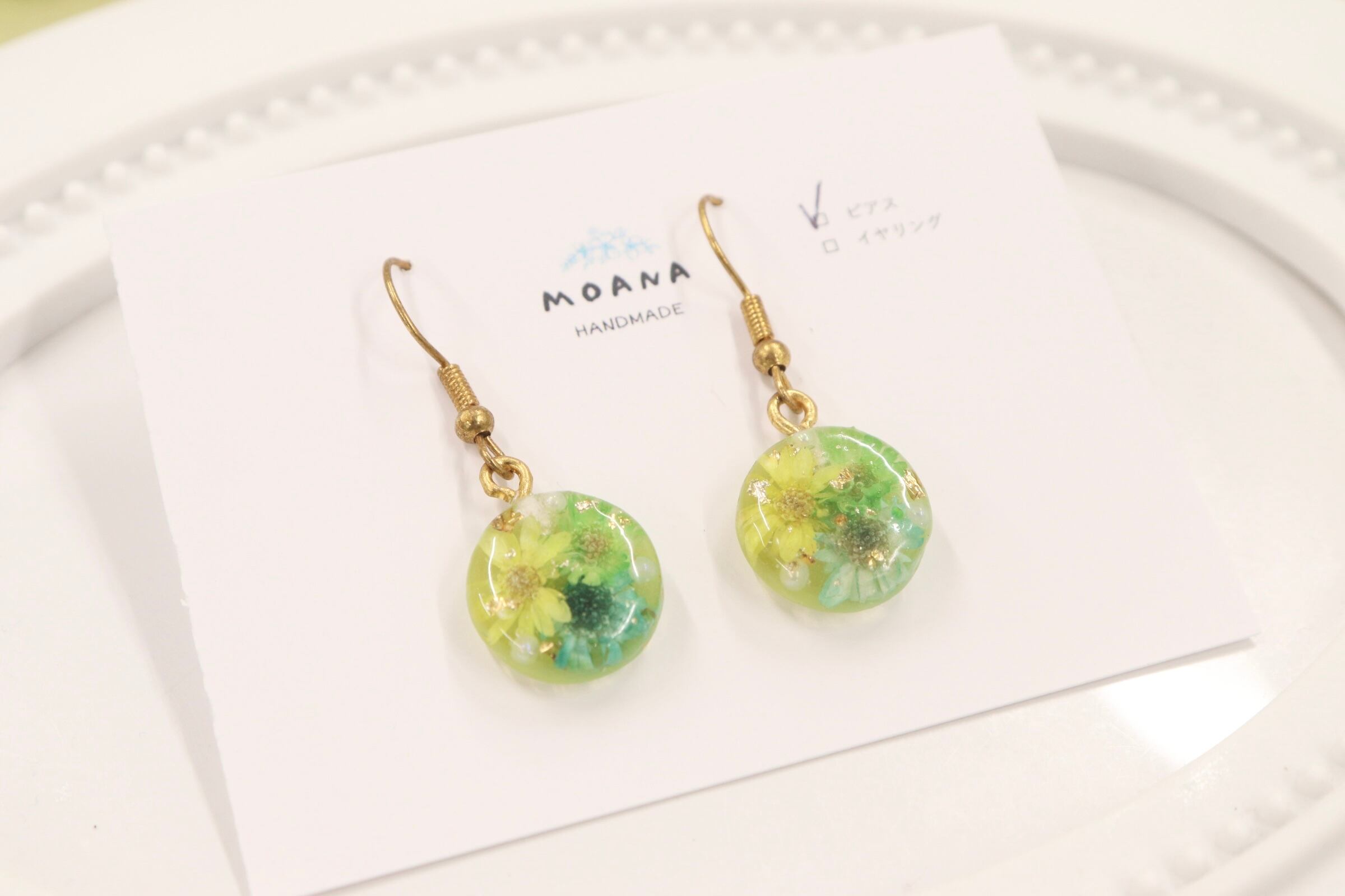 甘くていい匂いがする花に金箔をまぶして樹脂で固めたようなおはじき型のアクセサリーで御座います。
