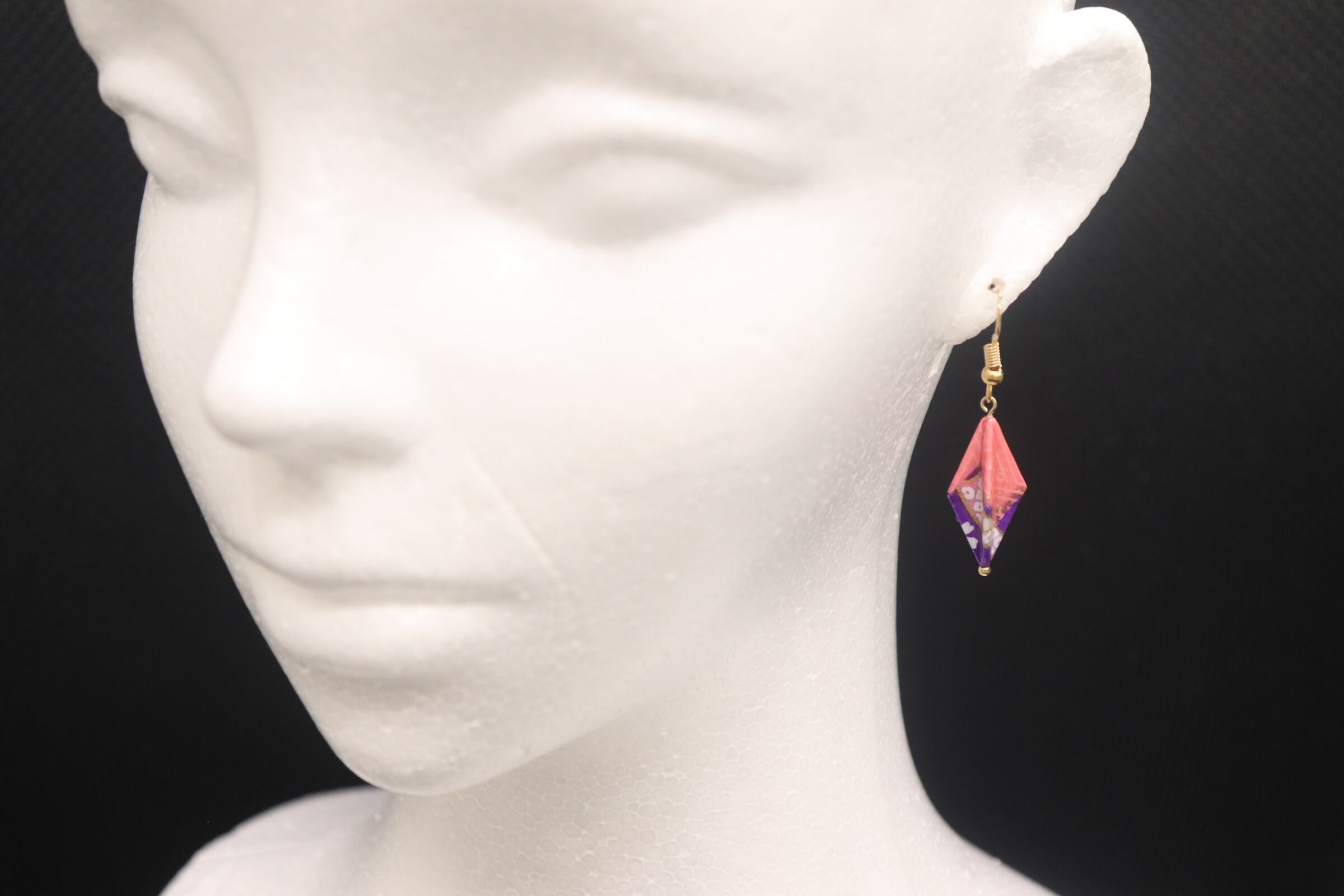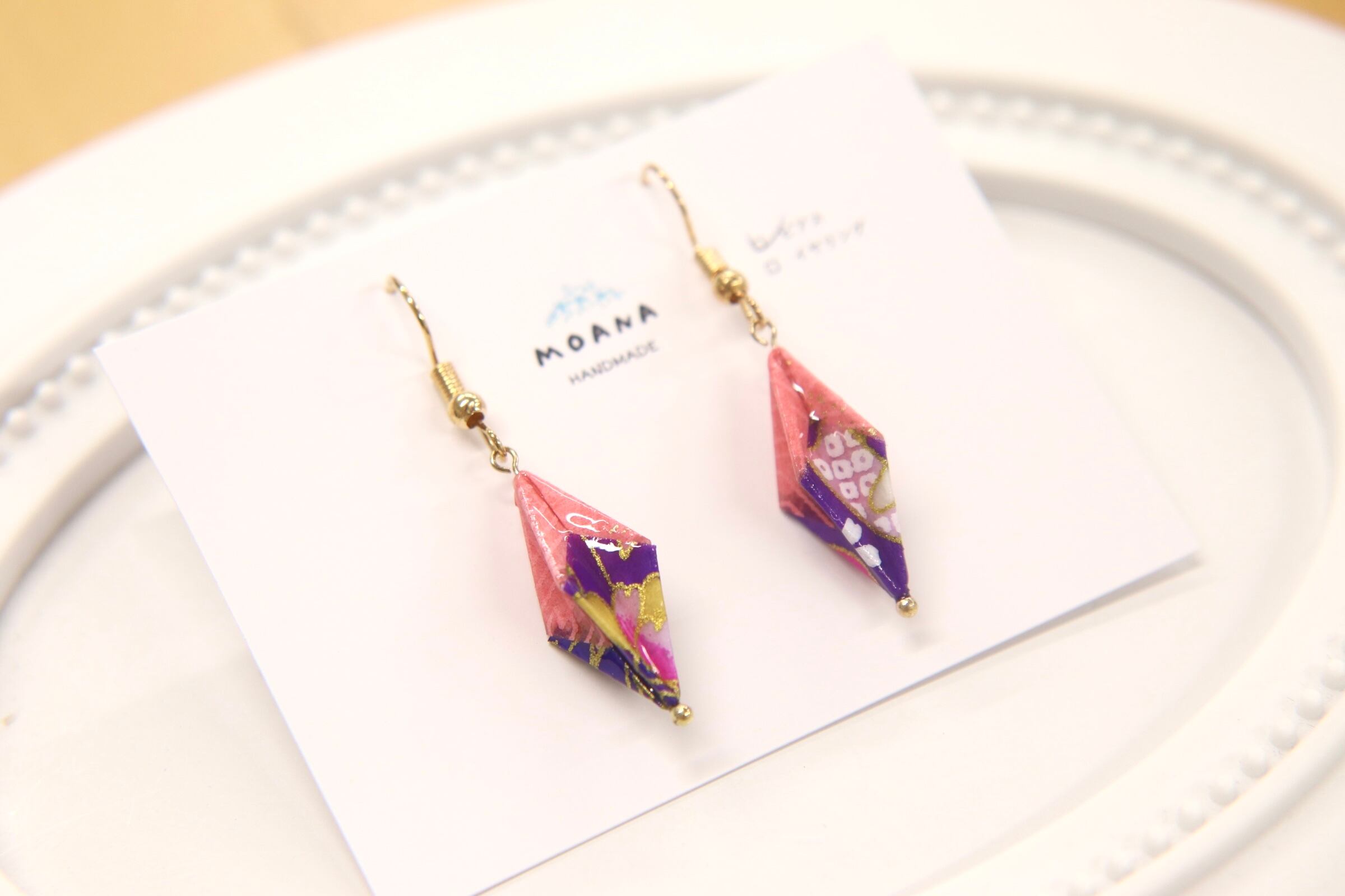 花柄の和風の模様を樹脂でひし形に固め、蜘蛛の巣と蜘蛛の巣に居る蜘蛛も固めたものをアクセサリーにしたかのようなピアスです。