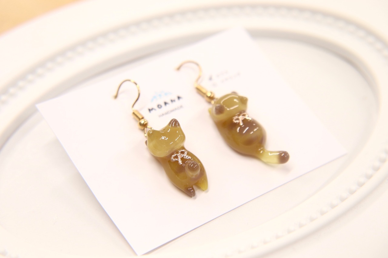 片方づつ動きの違う、可愛い猫のピアスです。背中にリボンつき。