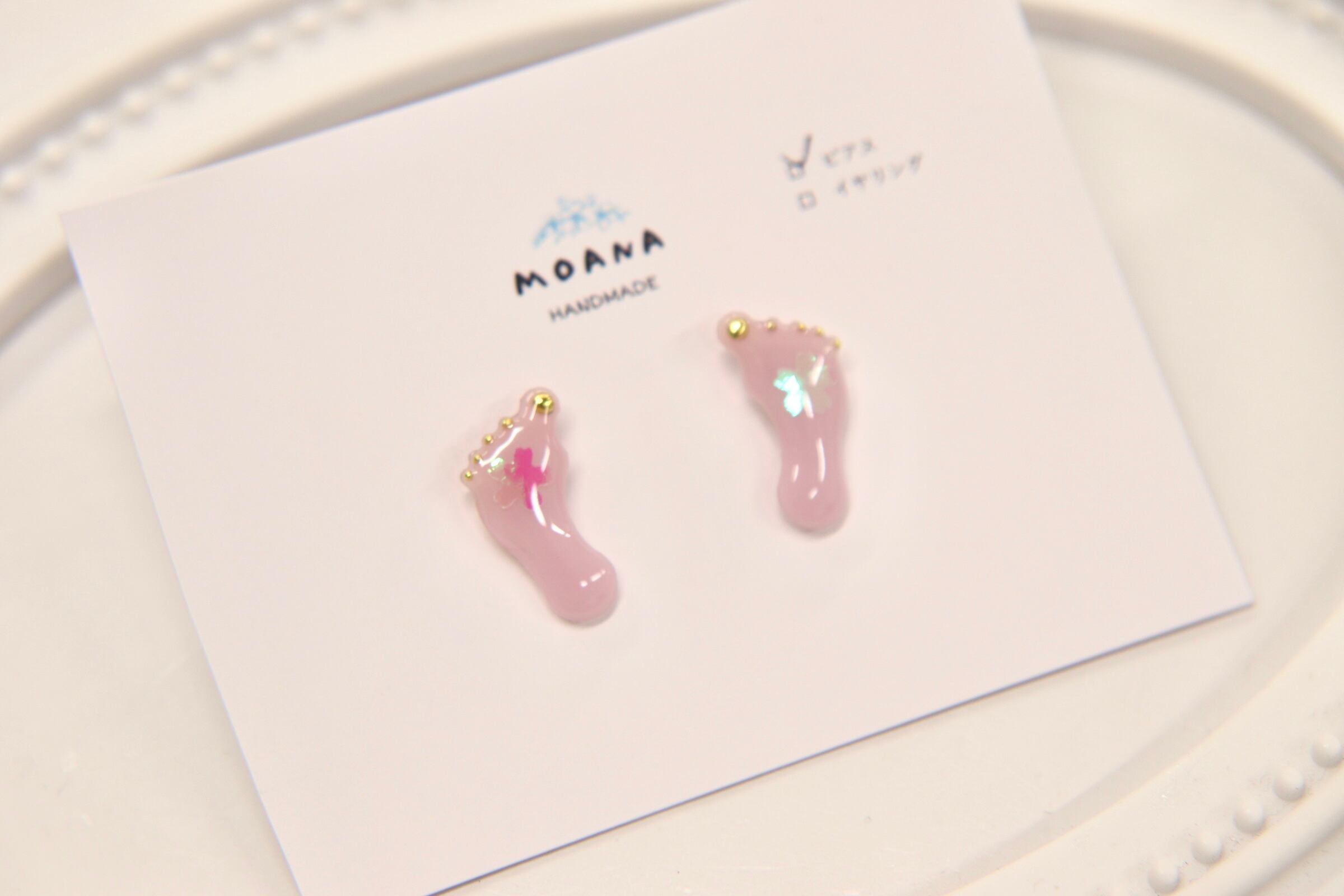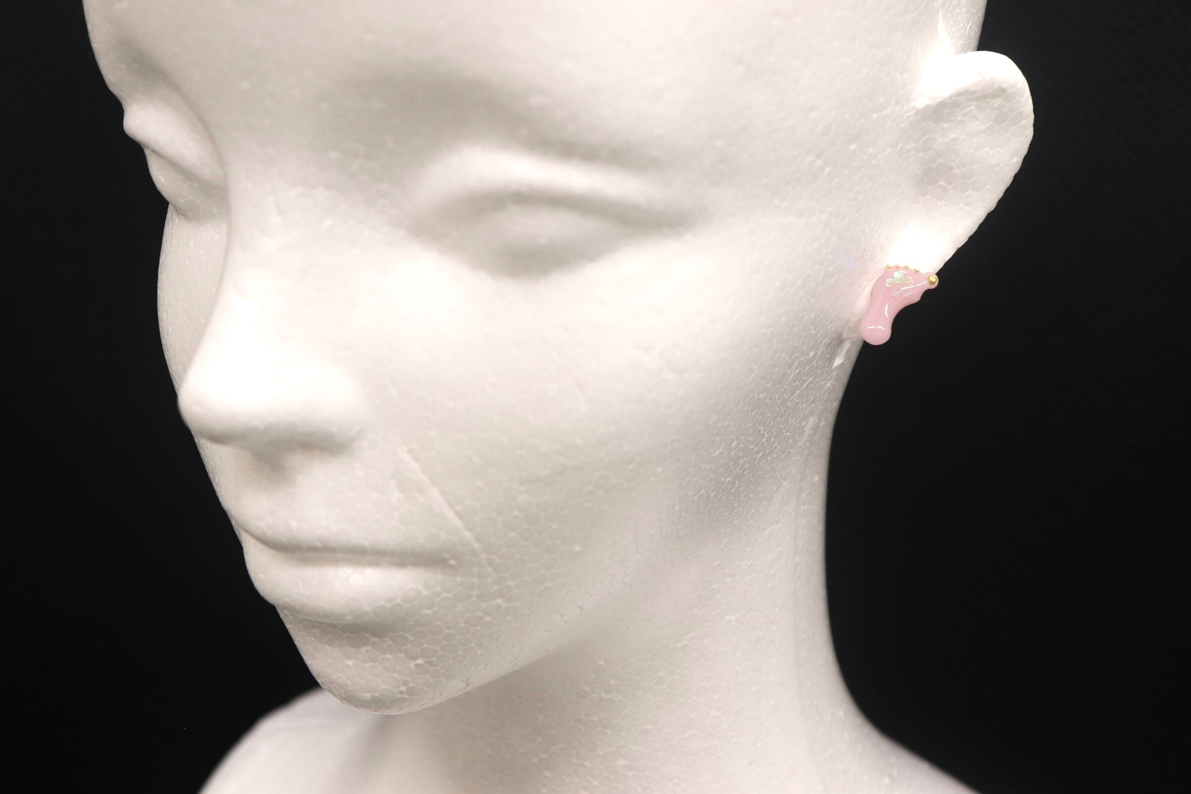 足型の桜の模様がついたピンクの桃味グミをアクセサリーにしたようなピアスです。